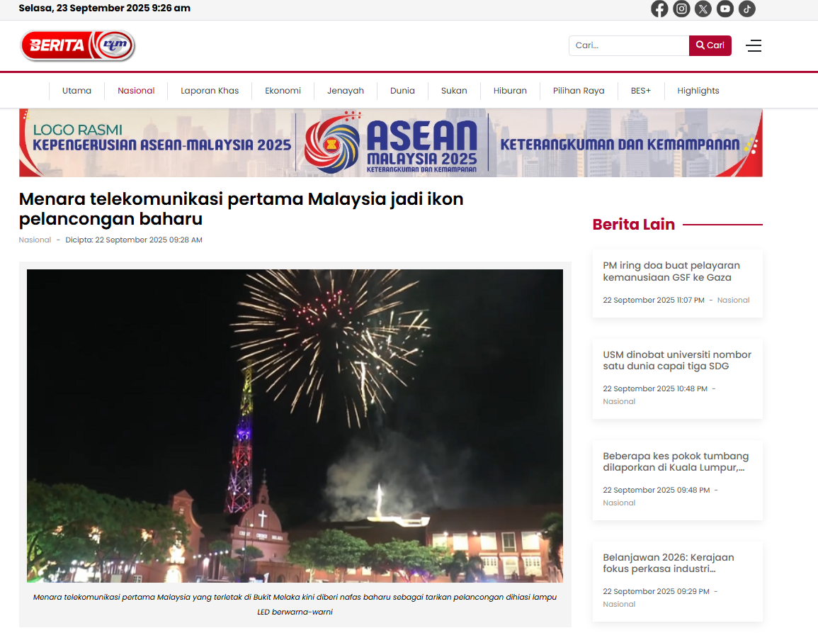 The first telecommunications tower in Malaysia, located in Bandar Hilir, Melaka, has been transformed into a historic landmark and vibrant tourism attraction with stunning LED lighting. This modernization enhances the tower’s visual appeal at night, offering a unique experience for both local and international visitors while celebrating Malaysia’s rich heritage.